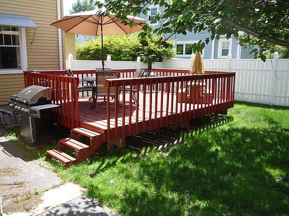Classic col on quiet street, fenced yard, 2 car garage. Fireplaced LR, DR w/built-ins, office/study, enclosed heated rear porch and large deck. Wood floors, new boiler, new windows in BRS and L/R. Pets allowed with extra security.