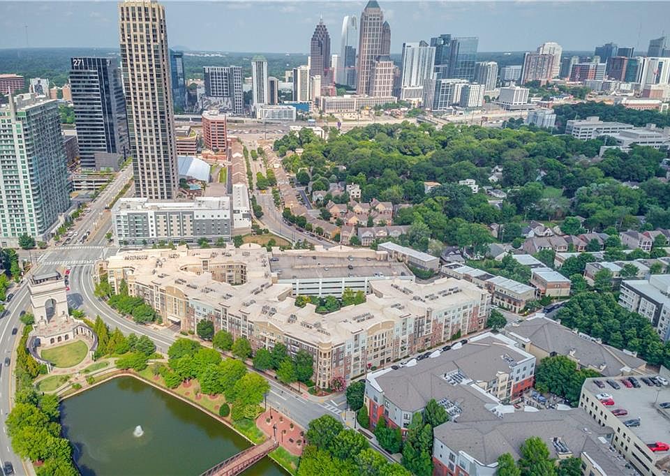 One of the larger 2/2 floor plans with two adjacent parking spaces PLUS an additional big storage room on the same floor as the unit. No other units across the hall affording more privacy for the owner of this private unit. A truly unique "bright and inviting open-feel" location with an unobstructed seasonally changing private view of nature and Midtown from every room!! Cool summer greens, colorful autumn foliage, winter with mesmerizing city lights pouring in with professionally manicured gardens in the spring all to be discovered as you settled in. The kitchen opens into the family room area and balcony. The primary bathroom has a walk-in shower, tub, double vanity, linen closet, and walk-in closet. The separate dining room can also be used as an office. Ceiling fans, s/s appliances (KitchenAid refrigerator and new microwave/cooktop oven), smart thermostat, granite kitchen counter top & breakfast bar with 2 pantries. Split bedroom plan with a double door that provides privacy for the second bedroom suite. Gently lived in part of the year and meticulously maintained. High speed internet is available. Amenities include security, a beautiful pool, outdoor grills, Zen garden, fitness center, business center, on-site property management, & professional landscaping maintenance around the property Walk to GA Tech, the dog park, lake with walking trail, Atlantic Station with all its events & entertainment, restaurants, shopping, Publix, and Target. Atlantic Station, an urban work/live/play community with a dedicated public safety effort has close proximity to both 75/85 highways, Buckhead, Midtown, Westside, Arts Center, Peachtree Library, Piedmont Park, Marta Station, and Fox Theater. Many major high-tech companies are located nearby, i.e. Microsoft, Apple, Cisco, Google, NCR, Cox Automotive, Cricket Wireless, with others moving to the area.