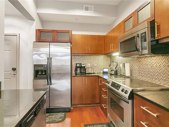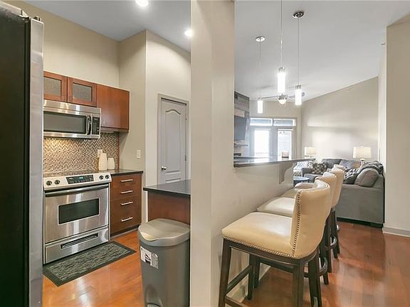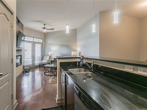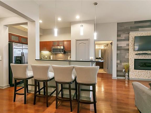 This chic 1 bedroom/1 bath condo located in the bustling Atlantic Station district where every amenity was designed in the area to be a pedestrian friendly community of entertainment, shopping and soon to be the home of corporate giant Microsoft. Features of this top floor unit include an open concept living room with a linear glass front wall mounted electric fireplace bringing luxury and modern comfort of a real fireplace crafted from metal, in a black finish, fire glass beads and flickering flame effect. Trendy hardwood floors, decorative glass back splash and clean line cabinets update this kitchen for any modern enthusiast. Ample pantry storage space is key and this kitchen has plenty to keep you organized. Sleek stainless steel appliances allow the kitchen to become the heart of the home with the ability to easily create meals at home or warm up those Uber eats! Owner suite is complete with spa like soaking bath, separate shower, and walk in closet. Additional space includes an at home office/home school area or dining nook flanking the open living area overlooking a beautiful view of the city, Millennium Gate and Common Pond park. Secure deeded parking, swim, lounge area offer you a complete package for the Midtown lifestyle. See this home today & write a contract tonight!