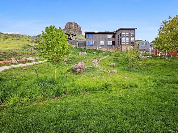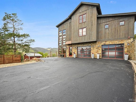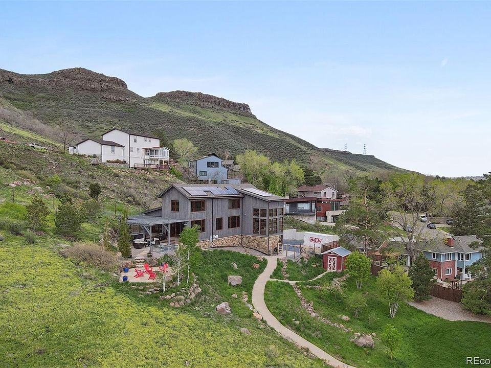 Unique and rare property on an acre of lush mountainside on South Table with amazing mountain and city views located just blocks to downtown Golden. This custom home was built in 2016 with an award winning Colorado architect and a love for awesome views along with walkability to downtown Golden for all the fun shops, restaurants, breweries, and venturing by foot or water in Clear Creek. The views focus on Lookout Mountain in front during the day and the city of Golden at night. Out back is a striking view up to the top of South Table mountain and then down the greenbelt with 360 degree views out all the massive windows. The homes is bright and open, full of natural finishes with a high-end luxury for comfortable Colorado living. The expansive main floor is wonderful for entertaining and extends out onto the back patio with pergola, fire pit, raised garden, and room to lounge and take in the views. The acre is half wild and half organized allowing for nature to mingle with concrete paths and a large grassed area for play. Fruit trees, wildflowers, scotch pines, and beautiful aspen are sprinkled throughout the property. Inside the primary bedroom has a large en-suite double shower, double vanity, and walk-in closet. Every surface selected with care and curated for a modern farmhouse feel. The elegant steel staircase is enclosed within three floors of windows and added space for a future elevator. The next floor holds two large bedrooms, a double shared full bath, and a guest suite with en suite full bath for privacy. The surprise room in the basement is for fun in the Wild West with a bar, popcorn stand, and a variety of games including air hockey, foos ball, poker table, and shuffle board. Almost too much to fit in such a fun and beautiful home located in the heart of Golden with some of the best views in town!