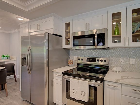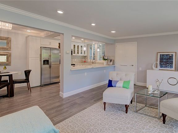 THIS STYLISHLY REMODELED GROUND LEVEL HOME MAKES A STRIKING IMPRESSION! As you enter the property you will immediately notice the custom features of this lovely home with an open concept floorplan. The main living area is light and bright with natural light coming through the wall to wall windows. The entertainer's dream kitchen is stunning with white shaker soft close cabinets and drawers, pull out shelving, quartz countertops, Carrera marble backsplash, stainless steel appliances and a large island which is a cook's delight. A spacious living room opens directly to the patio where you can enjoy a barbeque with friends or relax with a good book and a glass of wine. A beautiful Master Suite includes his and her closets and a spa-like bathroom with frameless shower. The guest bathroom is another beauty! Additional features of this fabulous home include: new dual pane energy-efficient windows, new electrical panel, LED recessed lighting, laminate flooring throughout the main living area and ceramic tile flooring in both bathrooms, smooth ceilings, crown molding, baseboards, mirrored closet doors in the guest bedroom, frosted interior doors, new stackable washer/dryer, rain shower heads and the list goes on. Conveniently located & just a few steps away from your carport. Make this lovely home yours and start enjoying all the amenities of Laguna Woods Village. Where New Adventures Begin!