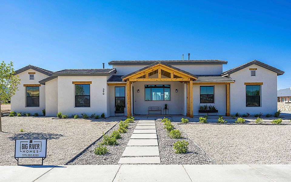 Big River Homes presents this one-of-a-kind modern country design. This architecturally unique home features a custom cedar wood post and beam entryway. Located in Rancho del Gallo which boasts views of serene farmland and pecan landscapes. For more information please call: 575-202-8917.