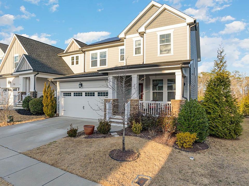This 3/2.5 home in Briar Chapel has so much to offer. You'll be walking distance from schools (elementary, middle, k-12 charter), sports courts (bball and Pickle -ball), and parks. The home has a ton of flex space with a dedicated office downstairs and large loft upstairs with a perfect nook for a work station. Two large windows in the living room bring in tons of natural light. The lovely screened porch opens up to a large stamped concrete patio and large fenced backyard with treelined views. To top it all off the home comes with 20 solar panels and new HVAC systems. Don't forget the built in doggy den under the stairs. Everything about this home makes sense.