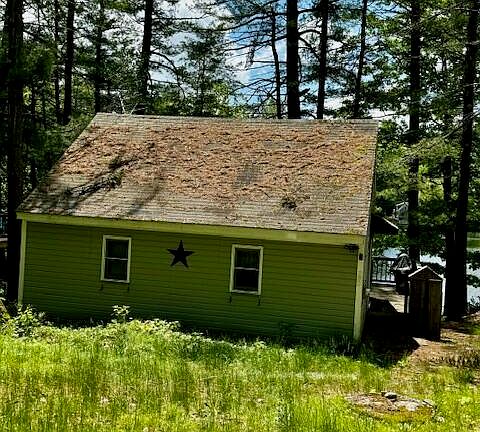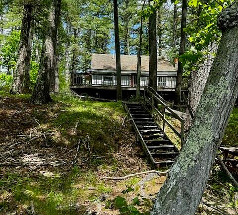 LOON POND- +/- 50' sandy shallow waterfrontage comes with this 1950's seasonal cottage with 2 bdrms, 1 bath that has loft area for more sleeping with large deck overlooking the lake. Cottage in need of some love in places but an affordable waterfront cottage to improve the value.