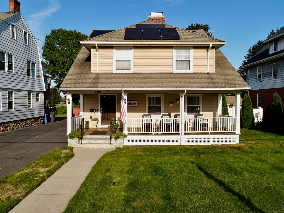 H & B Due Wednesday 9/24 5pm - Welcome to this timelessly elegant home that beautifully blends classic charm with modern comfort. Step onto the inviting covered front deck, complete with privacy awnings-perfect for enjoying crisp fall evenings. As you enter through the gracious front entryway, you're immediately greeted by the rich warmth of a gorgeous original wood staircase and gleaming hardwood floors that flow throughout. The living and dining rooms feature large, updated windows w/natural light & highlight the intricate original wood trim, creating a cozy yet sophisticated ambiance. The updated kitchen flows seamlessly into a charming breakfast nook-the perfect spot for casual meals & morning coffee. Step out onto the TREX deck and into your own backyard retreat-fully fenced & beautifully landscaped, ideal for entertaining. Whether you're hosting summer parties or relaxing in the above-ground heated pool, this backyard oasis is perfect. Upstairs, you'll find 4 generously sized bedrooms, each featuring hardwood floors, newer windows & AC for year-round comfort.1 bedroom offers a dressing/makeup room-a luxurious touch, another includes access to a walk-up finishable attic, perfect for transforming into your dream walk-in closet, studio, or home office. Upgrades include a newer roof, windows, vinyl fence, driveway, shed,2 car detached grg, boiler, hw heater & energy-saving solar panels.This is more than a home-it's a lifestyle of charm, comfort & elegance. You