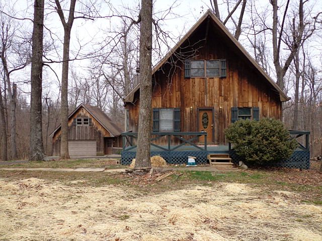 A-frame with 2 car detached garage on wooded lot near Hanson. Basement has 926 sq ft of finished living space with room with closet but no window, used as bedroom. garage has 220 service and 2nd floor storage.