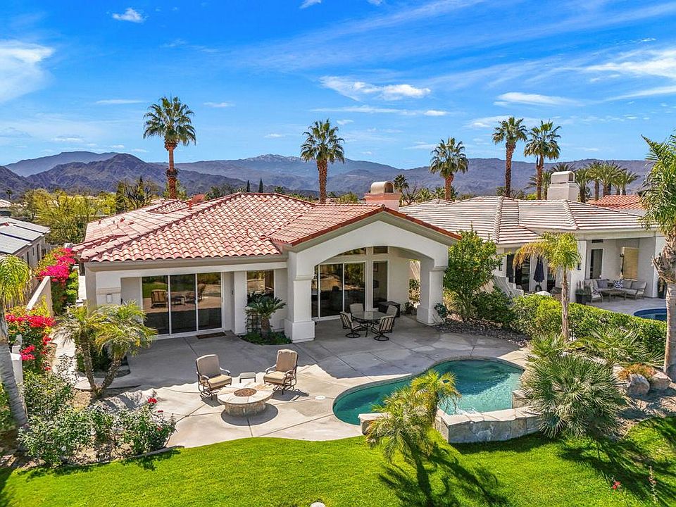 Introducing the sought-after Bougainvillea 2 floor plan, nestled gracefully between the 8th and 9th holes of the prestigious Arroyo Course within Indian Ridge Country Club. Boasting 2,742 square feet of luxurious living space, this home features 3 bedrooms, each with its own en suite bathroom, along with a convenient powder bath for guests. Step into the expansive primary suite, where indulgence meets comfort. Here, you'll find a spacious walk-in closet, elegantly beveled windows, a rejuvenating tile shower, and a sumptuous jetted soaking tub - the epitome of relaxation and refinement. Outside, a sprawling patio beckons, offering an oasis of leisure and entertainment. Immerse yourself in the serene ambiance of your private pool and spa, or gather around the inviting fire pit on cool, crisp evenings. With a captivating 180-degree panorama of majestic mountains, tranquil lakes, and lush fairways, every outdoor gathering is destined to be unforgettable. This exceptional property comes partially furnished, as per the inventory list, ensuring effortless transition into your dream retreat. Additionally, seize the opportunity to elevate your lifestyle with a Club membership, available without delay. Don't miss your chance to experience the epitome of luxury living. Schedule your appointment to tour this home today and unlock the door to unparalleled elegance and sophistication.