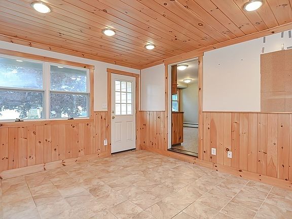 Single level living with country charm! The exterior of the home boasts a large and level back yard, cedar shingles, a young roof, single stall garage with a 220v outlet, off street parking for four, and a cement slab for a boat or camper parking. The three season, knotty pine sunroom allows exterior access to the front and back yard and flows into the kitchen. The eat-in kitchen features a cooktop range, knotty pine cabinetry and brick feature wall. Oak hardwood flooring flows through out the living and bedrooms. Both bedrooms are equipped with ample closet space. The bathroom features a tiled shower and jetted tub. Solar panels to be transferred to the Buyer. Property is being sold AS-IS. Some peeling paint on the exterior, may not qualify for all financing types.