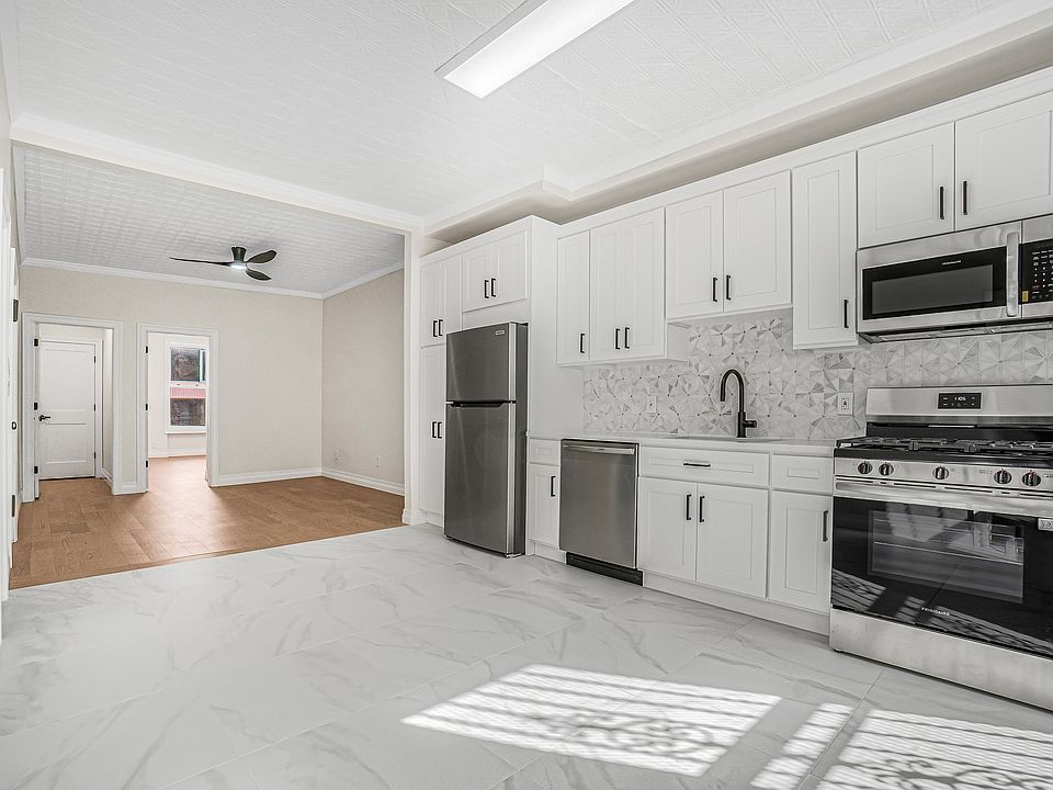The open-concept living and dining area flows seamlessly into a renovated eat-in kitchen with stainless steel appliances, a dishwasher, and abundant counter and cabinet space. Oversized south-facing windows fill the home with natural light, creating a warm and inviting atmosphere.