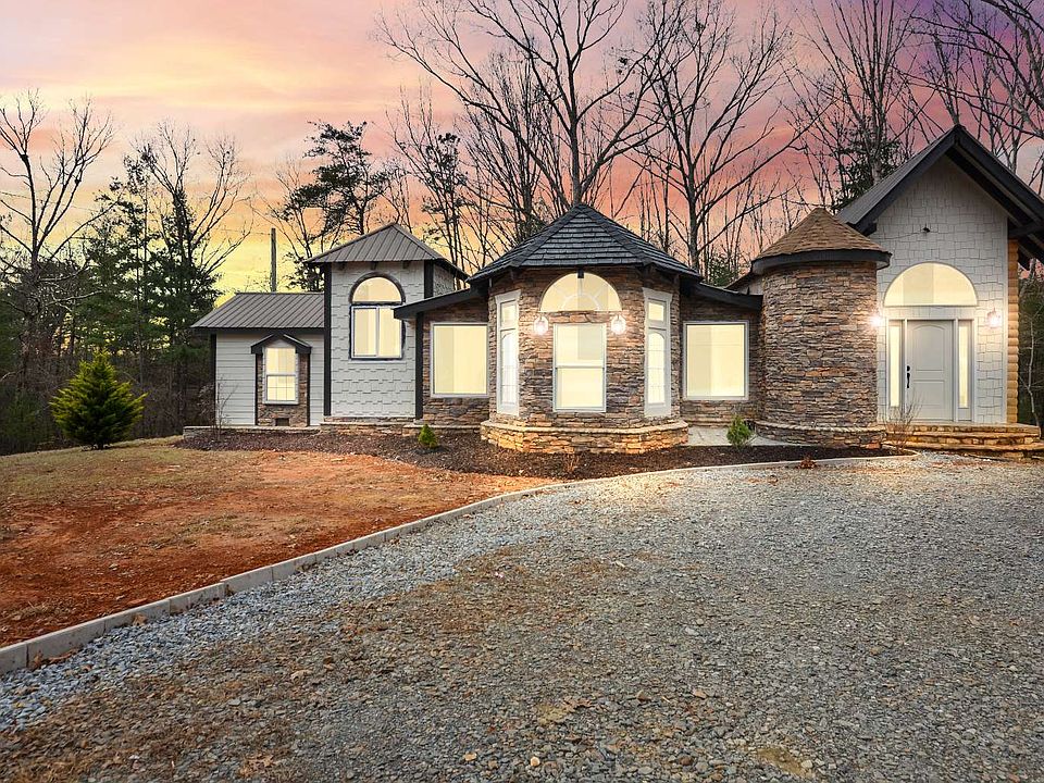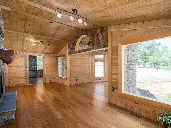 YOUR ELLIJAY CASTLE AWAITS! Shakespeare himself couldn't have written a better rustic castle setting than this. This is your opportunity to own a truly unique, one of a kind, custom remodeled home. Situated on nearly two acres this distinctive charmer presents wood floors, tongue & grove interior with custom wood finishes through out, granite countertops, custom cabinets with glass accent doors, breakfast bar, and a stacked stone gas fireplace. Huge picture windows allows the natural sunlight in making it light, bright, & airy inside. The second bedroom has shower, spacious room with a staircase leading to a loft, perfect for a kids play area, fun bunk room, office space, or craft room. Private master bedroom with en-suite bathroom, custom tile work, separate tub & shower. The one car detached garage is just as inviting as the home. Dressed with fresh paint, windows, & a door you could make this a separate guest cottage or she shed. Every detail in this delightful home has meticulously planned and placed.