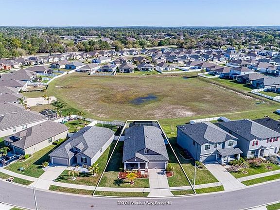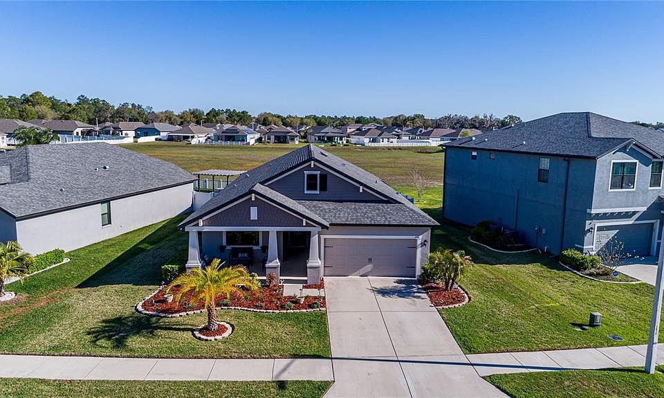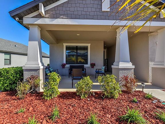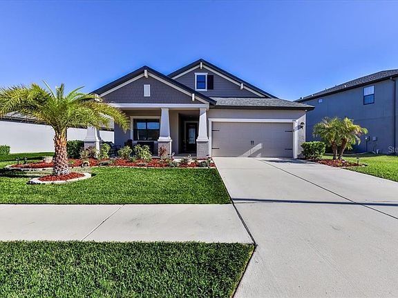 Chic, modern sensibilities await you in this gorgeous William Ryan pool villa! Built in 2018 in peaceful Villages of Avalon, this gem is practically brand-new and has been beautifully maintained by the only owners. It boasts some serious curb appeal from the covered front porch to the vinyl-fenced back yard. When you step through the front door, the soaring ceilings give this open-concept, split bedroom floor plan an extra sense of spaciousness. Attention to detail was paid in every aspect of this home, like the stunning quartz counters in the kitchen and master bathroom and the rounded wall corners. Cooks will adore the light and bright kitchen with its breakfast bar, eating nook, subway tile backsplash, and gleaming stainless steel appliances. The wood cabinets have a striking dark finish; the top-most cabinets are 42, and include a custom bump-out over the microwave. Host your next dinner part or intimate family meal in the dining room, which is tucked just off the spacious and open living room. If you need a private place to relax after a long day, the master bedroom is generously sized with a charming bay window and large walk-in closet. Melt your stress away in the jetted tub or separate shower; his-and-hers vanities means no one fights over bathroom counter space. The indoor laundry room adds convenience and a transitional entry between the extended 2-car garage and the main house. Fun in the sun await you on the brick paver-lined covered lanai and pool deck. Host your next barbecue in style, or bask poolside in comfort. The whole family will love the screen enclosed, in-ground pool with its wading pool shallow entrance and waterfall feature. Plus, the electric pool heater means you can enjoy a swim anytime! The Villages of Avalon is a lovely deed-restricted community with amenities that include a clubhouse, fitness center, and community pool. Veterans Memorial Park and Anderson Snow Park are both less than 5 miles away, and there are lots of other entertainment options within 10 miles, including the Airport Farmers and Flea Market, Lead Foot City, Masaryk Winery, and more. There are tons of local shopping and dining options nearby, too. The Suncoast Parkway is only minutes away for easy access to Tampa, its nightlife and amenities, and the international airport. This home absolutely will not last, so be sure to get in before you miss out!