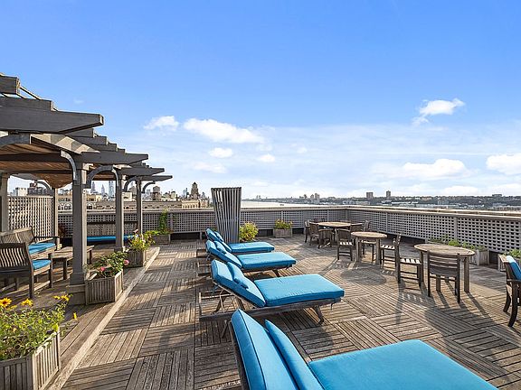 390 Riverside Drive is a full-service cooperative with a 24-hour attended lobby, live-in superintendent, fitness room, bike storage, laundry room, and a beautifully landscaped roof deck with sweeping views of the Hudson River. The building allows pied-à-terres, co-purchasing, guarantors, and is pet-friendly (cats only; no dogs).