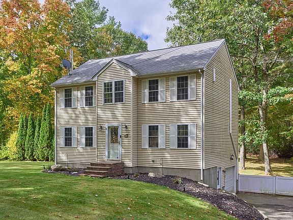 Looking for privacy? Discover this charming oasis featuring an in-ground pool & a cozy screened-in cabana, surrounded by lush flowers & fruit trees. This captivating Colonial home boasts 3 bedrooms, 1.5 baths, & is set on 1.4 acres! The first floor offers an open layout with hardwood floors throughout the living and family room. Spacious eat-in kitchen offering stainless steel appliances, eat at peninsula, & sliding doors that open to the back deck, which offers views of the expansive fenced in backyard. Convenient 1st floor half bath & laundry. The primary bedroom includes beautiful hardwood floors & a spacious walk-in closet. Also upstairs there are 2 additional good sized bedrooms & the full bath. Additional bonus room in the walk out basement, ready to be finished for even more living space! Solar panels help reduce electric costs. One car garage underneath! Backup generator, mini splits, pellet stove & a storage shed! Ideal location; on a back road just minutes to the Mass Pike!