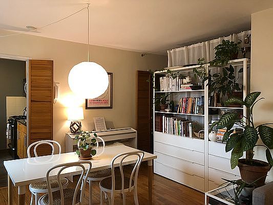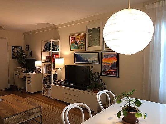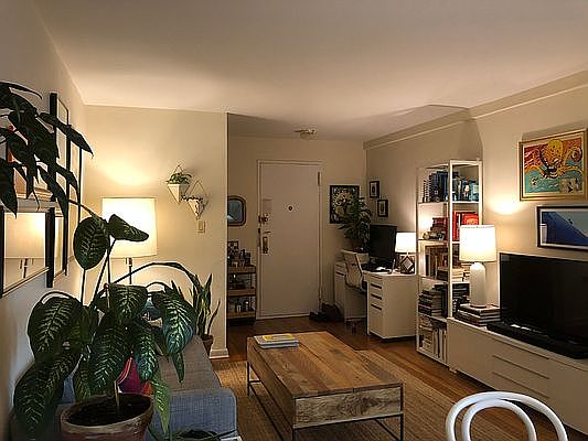 Well-configured L-shaped studio with separate sleeping area, located on a leafy, residential block. Large living/dining area, 24 feet long, allows room for dining table, couch, and more. Western exposure with neighborhood views enhanced by the afternoon sun. Windowed kitchen and living room and hardwood floors throughout. 12% Broker fee.