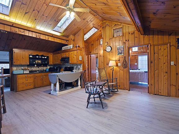 Creek front cabin on 4.2 unrestricted acres. Positively charming with walking bridges over creek, stained glass windows, wood burning stove, and lots of attention given to making it just right and cozy. Two bedrooms and 1 bath. Covered and open decks. Shower is done with river rock finishes. Craft room or third. Located on country gravel road for great walking. Don't waste any time. This property is priced to sale and is being sold AS IS.