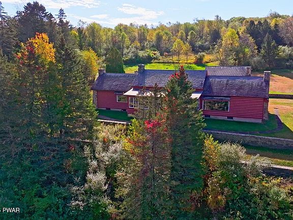 Set on 36.42 private acres overlooking Shohola Falls Lake and bordering Pennsylvania State Game Lands, this historic log home offers unmatched privacy, views, and access to nature. Originally built over 90 years ago and expanded in 1942, the property blends rustic charm with expansive living and recreational opportunities. Wildlife sightings include deer, bear, eagles, and pheasants.The log home features 2,310 sq. ft. of heated space (5,176 sq. ft. total), with 4 bedrooms, 1 renovated full bath, rich pine floors, and locally sourced ash logs. Four handcrafted stone fireplaces anchor the home, including a striking sunken living room fireplace. Two enclosed glass porches and a full-length front porch provide year-round lake and forest views. The finished basement includes a den with pool table, laundry area, and a U.S. military-standard bomb shelter with fresh-air circulation.The land includes hay fields, wooded trails, a raised hunting blind, and a mowed path leading to a tranquil pond with rowboat. Nine outbuildings include multiple garages, a stable, pig barn, woodshed, and a picturesque historic cow barn. Utilities include oil forced hot air (updated), deep well, and septic system. The property is enrolled in Act 319 Clean & Green.Once a dairy farm owned by noted sportsman Phil Neuweiler, this rare estate is ideal for hunters, nature lovers, or anyone seeking a secluded legacy property. Additional parcels are available separately.