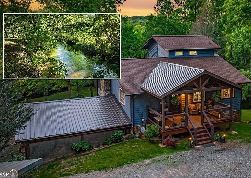Nothing else like it on the market. Tucked at the end of a quiet, private road, this exceptional 10.62-acre UNRESTRICTED property offers absolute privacy, fully usable land, and breathtaking natural beauty. With over 1,000 feet of bold, flowing creek frontage, additional springs and streams, and long-range sunset views over the Cohutta Mountains, this setting is truly special. The land is ideal for a hobby farm, homestead, or room to explore. A well-built barn (2020) with concrete pad and power adds flexibility, while an extra-large custom-built carport over the garage entrance provides exceptional covered storage. Updated in 2024 with additional improvements completed in 2025 (brand new roof), the home is warm and inviting with an open-concept layout centered around a beautiful wood-burning fireplace. The updated kitchen and baths offer abundant cabinetry, and a thoughtfully added butler's pantry with laundry features windows overlooking the nearby streams and wildlife. Outdoor living shines with beautifully expanded covered porches, plus one cozy screened-in porch-perfect for enjoying the peaceful mountain setting in every season. A spacious hot tub is ideally positioned to overlook the creek and mountain views, creating a true retreat-like experience. The partially finished basement includes a garage and insulated, climate-controlled workshop space. With end-of-the-road seclusion, no restrictions, and endless possibilities-from a private mountain retreat to a vacation rental or small event venue-this is a rare opportunity. You don't just see this property you feel it.