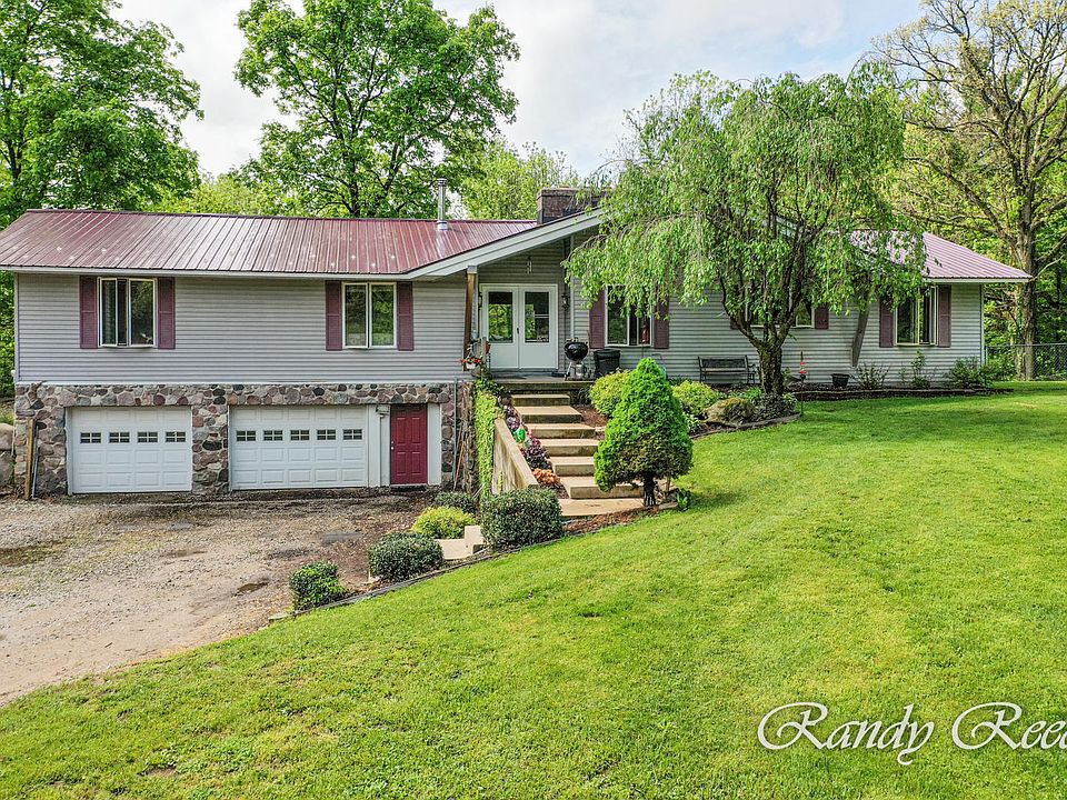 This 5+ Bedroom 3 Bath Walkout Ranch sits on 10 private wooded acres a 1/2 mile South of 13 Mile Rd at the end of a private drive. It has 3 fireplaces, a metal roof, a wood stove, a 76' long deck across the back of the home, a huge covered patio off the walkout level family room, and a 28'x30' attached garage. There is a chain link fenced backyard, a 40'x64' Pole Barn that is 14' tall, and a 48'x66' kennel barn that handles 50+ pups. It would give the buyer $1,000 a month if they allow the kennel operator to remain. Otherwise, it is just a great barn! The woods are full of deer, turkey and big majestic trees. Please enjoy a walk in the woods! The stone and brick work in this home is simply awesome too! This is simply a private, beautiful, and peaceful place to call home! Come take a look!