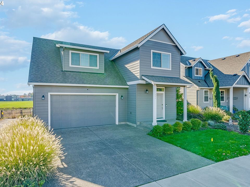 This charming residence awaits you in desireable Gracie's Landing! The main-level primary bedroom boasts an attached ensuite with dual sinks and a spacious walk-in closet. The open-concept design of the great room, complete with a gas fireplace, is ideal for hosting guests. The stunning kitchen features granite countertops, a stylish tile backsplash, laminate flooring, stainless steel gas appliances, and a pantry. Step out onto the covered patio in the backyard and savor the view; it's even prepped and ready for your hot tub! This home enjoys a prime location near walking trails and all the conveniences Newberg has to offer. Schedule your showing today!