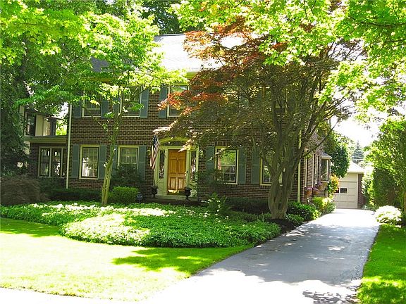 Stately Brick Colonial located on one of the Browncroft neighborhood's most beautiful streets. Classic details offered throughout: Hardwood floors, 2 staircases, French doors & leaded glass. The Living room with gas fireplace & crown moldings has 2 french doors leading to the fireplaced Den. Gracious Dining room has beautiful double leaded glass doors to the foyer w/powder rm; access to the back garden patio w/privacy fence & elegant staircase to the 2nd floor. Eat-in Kitchen w/wood parquet floor & all appliances included. The 2nd floor features the master suite w/multiple closets & a private bath, plus 2 more bedrooms including one w/direct access to the main bath & the 3rd w/sleeping porch. The finished 3rd floor makes a perfect guest/teen suite w/Bonus room, 4th bedroom & 3rd full bath.