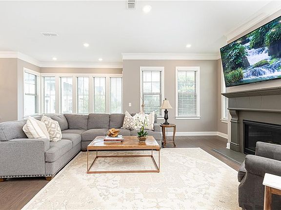 Gorgeous end-unit townhome in the gated Reverie on Cumberland, featuring one of the largest floor plans in the community with stunning skyline views of Atlanta! This 3BR/3.5BA home offers a step-less entry featuring elegant living across three spacious floors. The open main level boasts 10’ ceilings, hardwood floors, a chef’s kitchen with quartz countertops, stainless steel appliances, island with counter seating, formal dining, and a fireside family room. Enjoy Atlanta skyline views from the large covered terrace and oversized windows. The spacious primary suite features a soaking tub, dual vanities, walk-in shower, and custom closet. An additional ensuite bedroom and large laundry room complete the top level. The terrace level offers a private ensuite bedroom and dedicated home office with 2-car garage and abundant storage with built-in shelving storage. Ideally located in the community across from the pool with plenty of guest parking and one of the few units with a private front yard/greenspace just outside your front door. This bright and airy townhome will surprise and delight you as it lives so much like a single family home with plenty of open family living and private spaces with huge closests and abundant storage. Enjoy the resort-style amenities including large pool, clubhouse with terrace patio and fire pit, and fitness center, —all within a secure, gated community. This home delivers contemporary sophistication, comfort, and unbeatable location just minutes to Vinings Jubilee, Truist Park, The Battery, wonderful dining, shopping & the Silver Comet Trail and offers easy interstate/highway access.