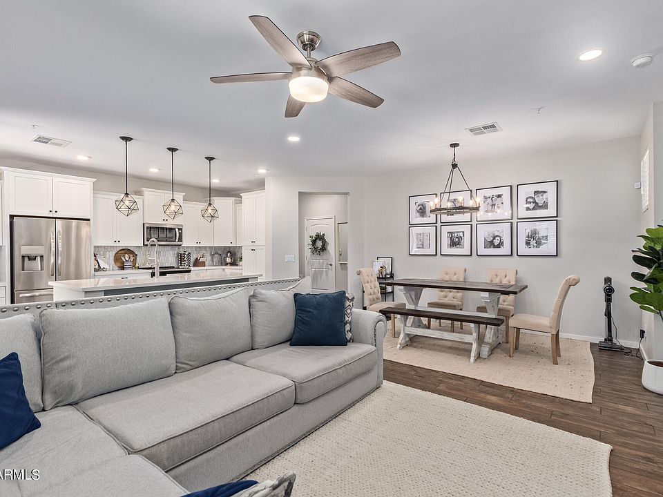 Turn-Key! Pride of ownership shows throughout this beautiful and well maintained 2 bedroom, 2 bath, side by side 2-car garage 1st floor condo. This unit has it all: gorgeous kitchen w/plenty of cabinet space, a large center kitchen island, quartz countertops, great room w/custom lighting. All appliances convey. Owner's retreat is spacious and bathroom has dual vanity, linen cabinet, over-sized shower and large walk in closet. Inside laundry room. Ceiling fans throughout! Gated community with resort style living with pool, BBQ, Ramada, fireplace, dog park and much more. Great location: minutes to freeways, airport, shopping, South Mountain Park and Preserve w/tons of hiking trails, golf courses, etc. Come take a look at this BEAUTIFUL home.