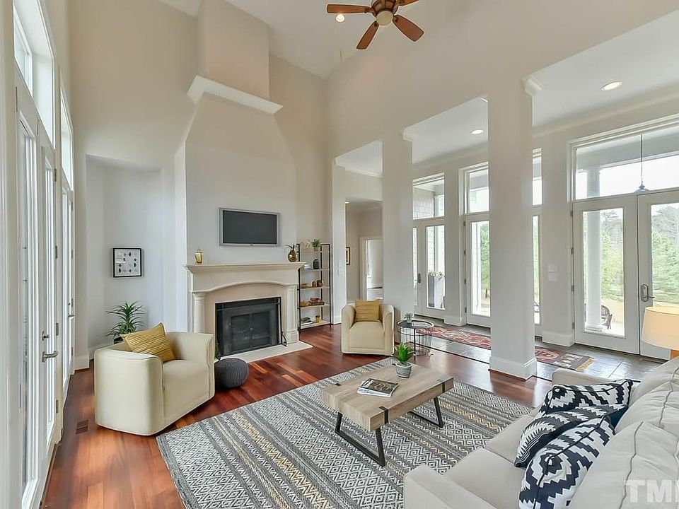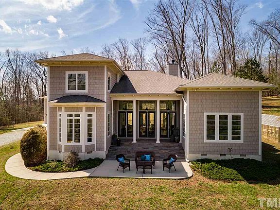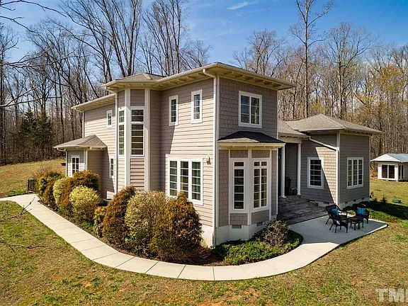 Beautiful custom home on 10 acres has private views, stocked pond, detached studio/living space, and is located 20 minutes from Duke University and downtown Hillsborough. Inviting living area w/ high ceilings and abundance of glass doors and windows that allow natural light to pour in. Huge office w/ pond views, formal dining area and a main level master bedroom w/ doors onto courtyard. Fresh interior and exterior paint, fruit trees (peach, plum, apple, pear, persimmon). Ideal space to relax and recharge.