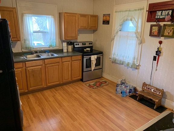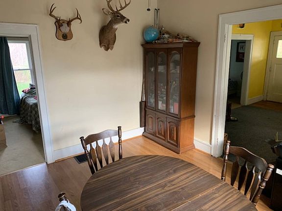 Entrance: Open front porch leads to living room. Living Room: Grey carpet, yellow painted walls white trim Dining Room: Large dining room has laminate floor, one wall with barn siding. Painted walls Kitchen: Oak cabinets, blue counter top, stainless sink, white walls. Appliances not included. Bath: Whtie fixtures, vanity, tub/shower. Washer/dryer room is in this bathroom. Bedroom: Low nap carpet, painted walls Bedroom: Low nap carpet, painted walls Bedroom: Was also back porch, low nap carpet, painted walls Basement: Outside entrance has over head garage door. Inside entrance from back porch/bedroom. Block basement has three rooms and holds the gas furnace and water heater. This basement has not had water from the river. It does get water from the garage doors if there is a heavy rain because the driveway leads downward into the basement. Drilled well, septic tank, LP gas tank. Lots of big yard space. Rushville school district but Beardstown address.