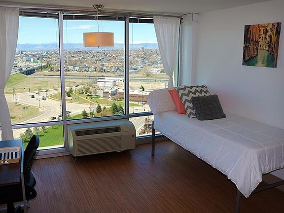 We are located in the heart of The Mile High City! Offering gorgeous views we are just 15 minutes away from downtown. The new B-Line & G-Line Light Rail Stations are just about 1.5 blocks away. We offer fully furnished units with a bed, 2 dressers, a desk and a chair. Offering top notch amenities with a full market on site, we have a full fitness center, indoor amphitheater, private study rooms, computer lounge, 2nd floor patio deck, open eating areas and gaming and entertainment areas. Offering affordable 1-2 Bedroom units starting at $799, everything is all inclusive. You get a fully furnished unit, all utilities ,cable, internet service, full AC/Heating control, Front Desk staffed 7- Days a week and Security on site. There is no pet rent fee, but your animal must be an ESA Animal and you will have to fill out a form. We are currently offering a "Winter Special" which includes a $0 Application Fee, $0 Security Deposit and a one time only payment of $175 for the Administration Fee which is non-refundable.