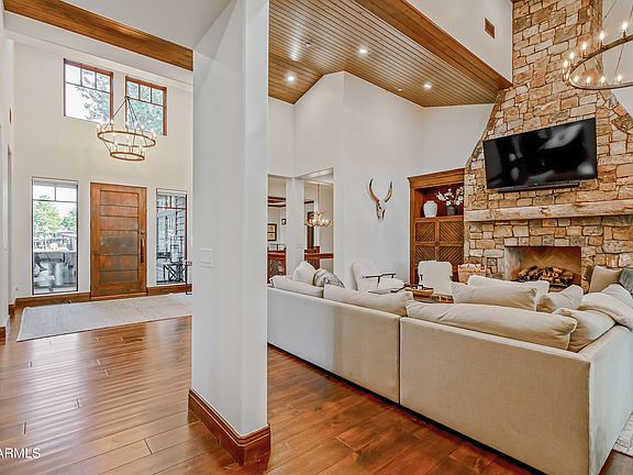 Remodeled and newly furnished by renown Prescott Valley designer at the top of 18th tee and fairway in Pine Canyon. Perfectly situated between the train, yard and clubhouse this resort cabin boasts quartzite counters, chunky white backsplash, Rejuvenation brass and matte black fixtures and restoration hardware furnishings. Great room features a grand stone fireplace and chef's kitchen with full wet bar, formal dining area, smaller breakfast nook with a lavish wine closet, island with additional bar seating, vast range with 8 burners, custom hood vent, 2 separate ovens, and large refrigerator and freezer. Elevator from ground level to main. On main level, the primary suite includes fireplace, private access to the spacious deck with hot tub, and a bonus loft bedroom, perfect for workout, kids bunking or seating area. Primary bath consists of a gigantic steam shower, separate Whirlpool Tub, dual vanities, a makeup vanity, dual closets, and laundry with utility sink. Main level also includes guest bedroom and office area. Lower level of the home holds 3 bedrooms- one with custom 6 sleeper bunks, 2nd family room with fireplace, dining area, a 2nd wet bar and another laundry room. Heated driveway leads to 3-car garage. Home also includes 2 dog doors, spacious wrap around deck with a built in BBQ and hot tub, expansive open and covered patio with a huge dog run and even an elevator. Epitome of mountain relaxation with breath taking views of San Francisco Peaks.