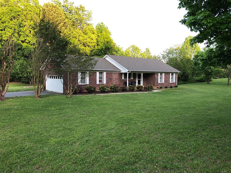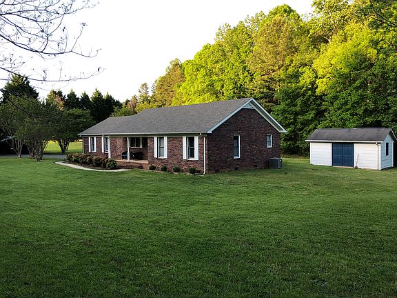Full brick ranch with 2car garage on very private 1.71 acres nestled in a great location! Addl 2 car carport with asphalt floor. Owner is relocating. Purchased last May and had full home,pest,septic,water inspection. Home in great condition/seller updated all interior. On Trinity Church Rd but home sits off the road w/cedar trees lined down the entire front yard for very private setting and 2 large pecan trees. You can't see another home! Relax on rocking chair front porch or back deck both with great private views while you sip your coffee/tea. Open floor plan. Kitchen/dining/LR/hall spruce hardwoods. Bedrooms new carpet. Kitchen new cabinets/granite counter tops/new SS appliances. Can easily add center island in kitchen if needed. Dining area has new french doors leading to deck. Both bedrooms have walk-in closets. Master bath stand up shower. Hall full bath updated w/granite countertops. Roof arch shingles 2017. Building 244 sq' with electrical and lean to off back. Move in ready!