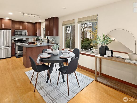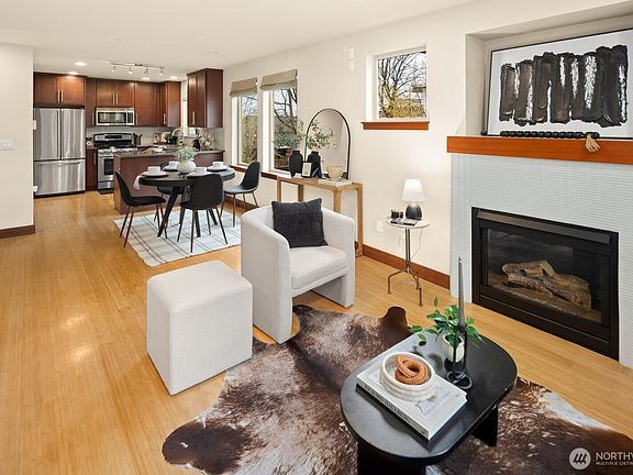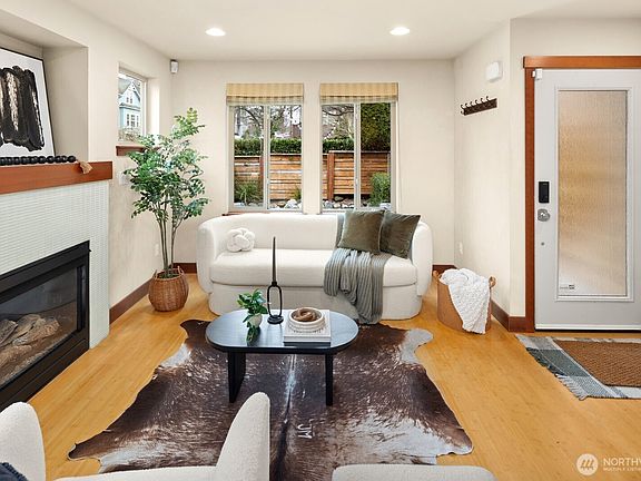 Rare Fremont corner-unit townhouse with no HOA! This thoughtfully designed home features bamboo floors, Caesarstone counters, and stainless steel appliances. The open main level is bright and airy, seamlessly connecting the kitchen, dining, and living areas. A balcony off the kitchen is perfect for barbecuing, while the private composite deck is ideal for outdoor entertaining. Upstairs, the primary bedroom features an en-suite bath and a spacious closet. The second upstairs bedroom also has its own en suite bath and plenty of storage. A third bedroom or flex space for an office/den sits on the first level next to the garage. Attached garage provides parking and/or storage. Walk Score of 91—minutes from downtown, Wallingford, and Lake Union!