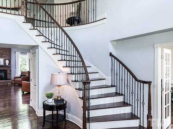 A gorgeous estate home nestled on over an acre of land that borders a wooded conservation area offering a private escape on the Raleigh/Cary border. Situated on cul-de-sac lot the 4 bed/4.5 bath home features a grand foyer w/curved staircase, 1st floor study, an open family room w/a gourmet eat-in kitchen, a large MBR suite that includes a spa bath w/heated floors, his/her closets & a sitting room; beautiful H/W floors throughout. Conv. to DT Raleigh, Cary, and RTP. Sellers added over $100K in upgrades.