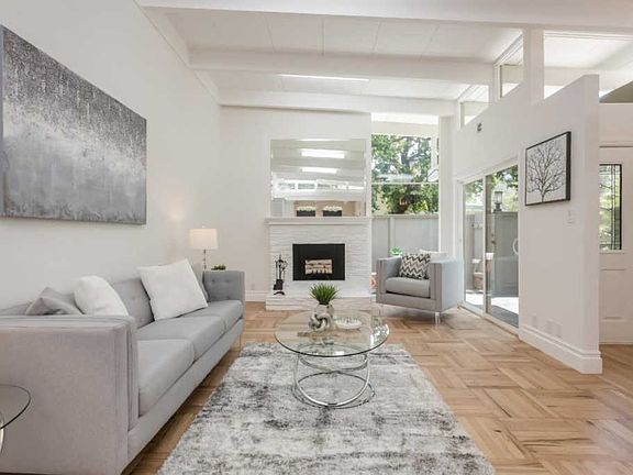 Remodeled single-story unit in highly desirable Las Casitas gated complex surrounded by beautifully landscaped grounds, palm trees and pool. Bright, open living space, hardwood floors and exposed-beam vaulted ceilings with an abundance of natural light. Charming private patio, renovated kitchen, quartz counter tops and stainless steel appliances. In-unit washer/dryer, Nest Thermostat and brand new air conditioning unit. Convenient to vibrant neighborhood dining, shopping and amenities including Piazzas Fine Foods, Mitchell Park & Library, Magical Bridge Playground, Cubberly Community Center, walk to top Palo Alto Schools and easy Hwy 101 access to Silicon Valley tech companies.