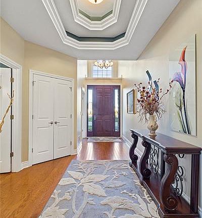 Former model home. Open floor plan with hardwood flooring in entry, first floor hall, dining room, kitchen, and living room. Center island kitchen with S/S appliances and convection oven. Granite countertops in kitchen, powder room and master bath. First floor master bedroom with dual walk-in closets adjacent to master bath. Jetted tub in master bath with dual vanities. Extensive exterior living space with covered porch and open patio.