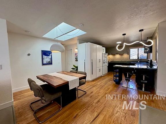 This beautifully reimagined North End retreat is nestled against the foothills and just minutes from downtown Boise, Hyde Park, and premier trail access. The open floor plan is illuminated by large windows, skylights, and custom light fixtures. Thoughtful use of natural wood, concrete-style floors, and curated textures throughout. Designer kitchen with sleek countertops, modern cabinetry, open shelving, and new appliances. The main living area is warm, inviting, and minimalist - the perfect space for entertaining and relaxation. Use the third room as a home office, extra sleeping space, gear storage, or workout area. The primary bedroom is tranquil with an ensuite bathroom, custom sink and lighting, expansive closet system, and sliding glass doors that directly access the backyard and 220V hot tub. The secondary bedroom serves as a charming nursery or flexible guest space. The oversized 2-car garage with air conditioning and level-2 EV charger more than adequately stores vehicles and toys.