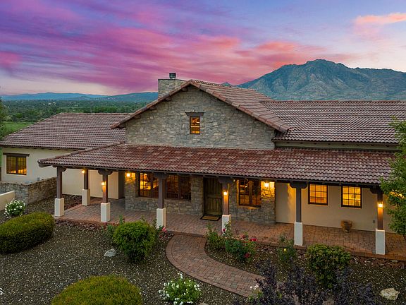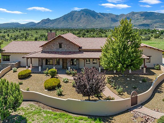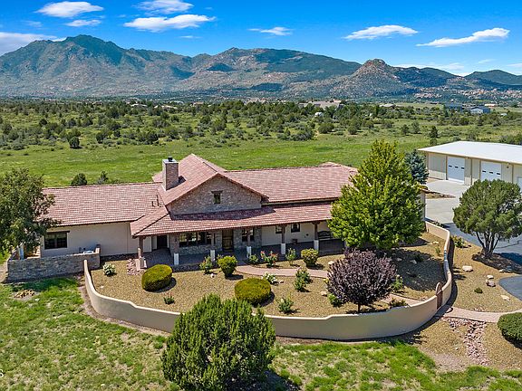 Located at the top of a gentle rolling hill with sweeping 360 degree panoramic views, this luxurious estate with rustic flare boasts views of Prescott's most iconic landmarks including and Granite mountain, Table Mountain, San Francisco Peaks, Mingus Mountain, the Bradshaw's! The sprawling single level property borders state land for endless outdoor enthusiasts & riding, and has outstanding curb appeal with mature landscaping and rose bushes as well as paved access all the way to the doorstep! Both the outside and the inside of this home has been impeccably maintained. There are tumbled paver walkways that lead through the courtyard entry to the front door and an expansive wraparound porch. CONTINUE...