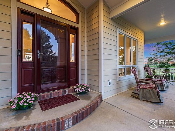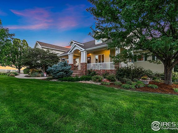 Stately ranch home on 6.7 acres with mountain views and 1,758 sf barn/shop. Bring your horses or have plenty of storage and space to enjoy all of your toys and hobbies! Home is on a private cul-de-sac, with beautiful lawns, trees and landscaping beds kept lush with irrigation water. An expansive front porch welcomes you to sit awhile and enjoy the lawns and morning sunrises. Both home and barn/shop are impeccably maintained and protected with hail/fire resistant James Hardie siding and class 4 impact resistant shingles, all installed 2021. Wonderfully cared for, the home has newer HVAC units and water heaters. Expansive windows provide views of the lawns and mountains even inside the home. The large kitchen with granite counters, hard wood floors, newer appliances and center island is perfect for those who love to cook and entertain, and is open to an eat-in area lined with windows. Flow from the kitchen to the family room where beautiful wood windows and cozy brick fireplace invite you to stay. The north end of the home is the primary suite with mountain views and separate door to the back deck. A five-piece primary bath completes the suite, with double sinks, soaking tub and spa-like shower. Also on the north end is a second bedroom/office. The south side of the home contains two bedrooms and 3/4 bath. Separate space for everyone yet plenty of room to gather together. Downstairs on the lower-level are two more bedrooms, a full bath, and living room with second brick fireplace! Daylight windows show the parklike backyard and bring abundant light. Horse owners will enjoy the 4 stall barn, paddocks, overhang, and grass pastures. Grow hay with available irrigation water if desired. Ride in the nearby community riding arena, or create your own. No horses? Perfect workshop/storage for all your toys! Only homes in Phase I of Belmont Farms have access to irrigation water, and are allowed livestock. Enjoy the country life, only a 15 minute drive to Fort Collins.
