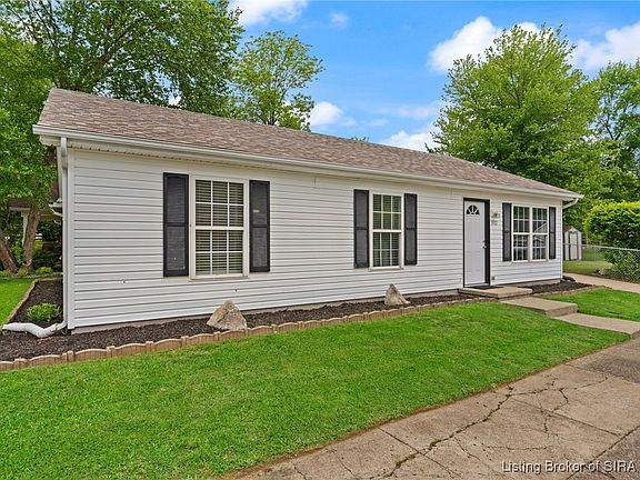 This adorable 3-bedroom, 2-bathroom home is situated on a spacious corner lot in the heart of the Charlestown Road corridor of New Albany and features a bright and open floor plan. The spacious eat-in kitchen is open to the living room and features new luxury vinyl plank flooring that also flows into the living room and bedrooms. There is no carpet in this home! Much of the interior has been freshly painted and the primary bedroom has a full private bath, while the 2 guest rooms are served by the full hall bath. The side yard is spacious, completely fenced and has a handy storage shed for all your outdoor tools. Conveniently located just minutes from shopping, dining, entertainment, Indiana University Southeast, and major interstates, this home offers comfort, affordability and accessibility. Updates within the last 10 years include: roof (2021) HVAC (2016) LVP, dishwasher (2021) and fence. Whether you're a first-time buyer, downsizing, or looking for a solid investment, this move-in ready gem checks all the boxes! Schedule your showing today! Sq ft & rm sz approx
