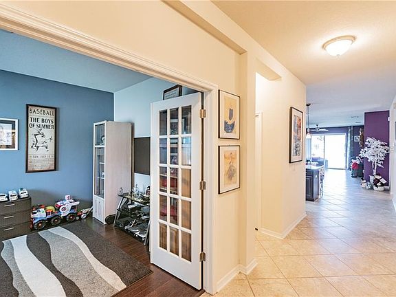This home gives you the feeling that you are going to walk into special from the moment you pull onto your driveway. Built by Ryland Homes with an exterior that includes stone and lush landscaping with palm trees that leave you thinking that the interior of the home will be just as grand. Upon entry of the home, you will encounter a foyer area and a bonus room that you could use as an office/man cave/or extra room. The foyer creates just enough of a walkway that makes you feel gitty as you approach a surprising open area and a beautiful kitchen/living room combo. You will immediately take notice of 42-inch cabinets with crown molding, stainless steel appliances, and a kitchen island with additional drawers for extra storage. The kitchen is not short of amazing and is compliments the living room area with ceramic tiling throughout with exception to the bedrooms. A lot of natural lighting, and a beautiful view of the pond in the backyard. The rear covered patio area is extended and perfect for entertaining and relaxing. The Master bedroom is a space for a proud owner to enjoy in as it is roomy and has an outstanding Owners bathroom with dual sinks, stands up shower, and walk- in closet space. This is a split floor plan so your guests will have their own space to enjoy. Come see this home soon before it is gone!