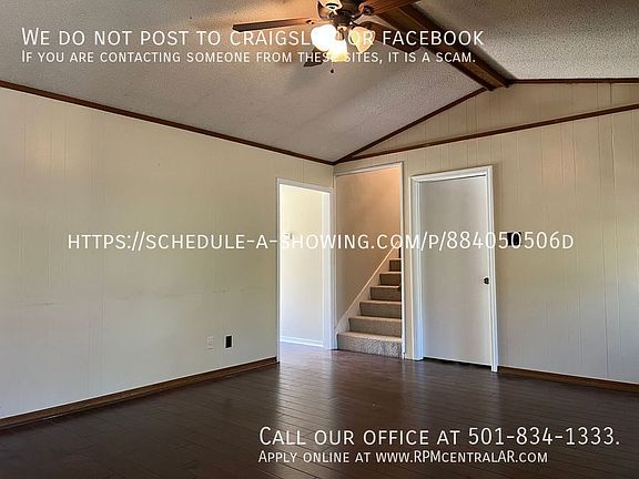 Real Property Management Central AR. Location Location Location! Zoned for Don Roberts Elementary. 3br 2ba with over 1770sq ft, just off Hwy 10. $1800/mo rent (Additional $35/mo charge for resident benefits and required insurance package) $1500 deposit and $150admin fee. Beware of many ongoing scams on sites such as facebook marketplace and craigslist where listings get copied and re-posted with incorrect information. Check our website . Features include; many updates inside, recent flooring and interior paint, updates in kitchen, den with wood burning fireplace, 2 car garage, large back deck, and more. 1 fully grown and house trained dog or cat may be approved with $350 pet fee and $25/mo pet rent. No.Section8.housing. Applications are Only submitted on Our website. Requirements and qualifications can be reviewed before submitting application. Each adult must complete a full and separate application. Application fee $50/adult, also paid on our website only.