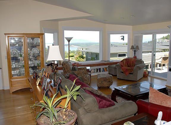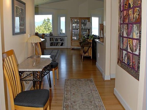 ISLAND & WATER VIEWS from custom Courtyd entry home. Tile, hardwds & vaulted ceilings highlight open style living w/window seat, gas frpl & access to view dk. Dining has built-ins & adjoins 'Cooks' kitchen w/double sinks, Viking cooktop & oven, silestone counters, breakft bar & desk area. Main flr master has jetted tub, step in shower & walkin closet. Elevator gives easy access to den/office down w/patio, 2 guest rms, bth & storage. In flr radiant heat up & down! CCR's $689,500 Neighborhood Description Great Upper End Area, House has elevator for easy access to both floors!