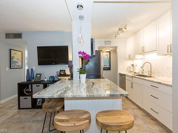 3 Bedroom/2 Bath Ground Floor Condo on Canal Side. No Bridges and just 5 minutes to the River. Unit includes many updates - Kitchen cabinetry and granite counter tops; Expanded Master Bath Large Tiles and Multiple Rain Shower Heads. Laundry in Master Suite Closet. The Patio which faces the Community Pool has all season sliders that open back to one door space and has sliding screen cover allowing use in cooler times for air flow, also the window blind is remote control operated for ease of opening and closing. Just a few steps to the Canal and Boat Slips. (Boat Slips are Available for Rent $100 Annually, owner may add boat lift with association approval- so restrictions on lift apply, see boat rules) The Unit has 1 Assigned covered parking space and an outside storage closet. There are additional guest parking spaces as well. Seawall completely updated in 2018 - New Community Paver Patio with Dock Lights. PETS ARE NOT ALLOWED (Service animals only allowed) WELCOME HOME TO YOUR WATERFRONT PARADISE - MARK I CONDO - A HIDDEN GEM, GREAT BOATING PROPERTY WITH CONTEMPORARY INTERIOR DESIGN - TV and TV Mount convey with property.