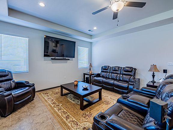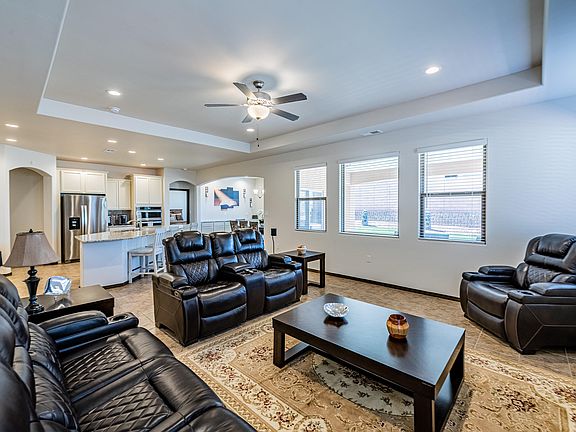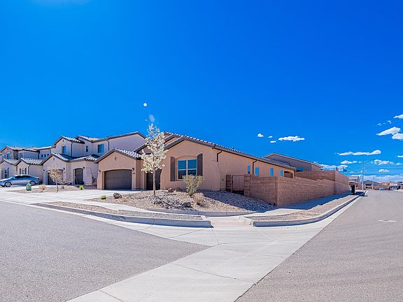 Breathtaking Abrazo home located on an oversized corner lot with views of the Sandia Mountains. Walk into an open floor plan concept perfect for entertaining, smart home ready. The amazing kitchen has tall cabinets, large kitchen island with stainless steal appliances. The large owners suite is it's own private oasis and has an oversized walk-in closet. Enjoy a quiet evening sitting on your back porch overlooking your large landscaped yard with underground pigtailed drainage, turf, block wall, block flower beds, red gravel plus walking block paths. Don't miss out on this stunning home!