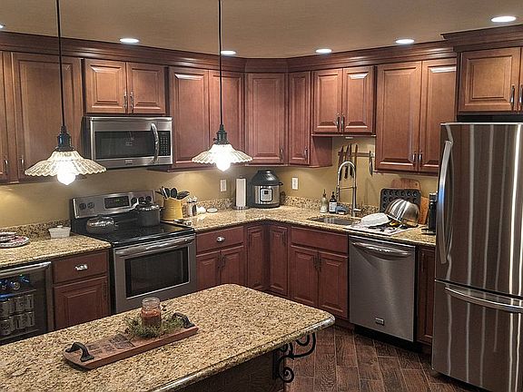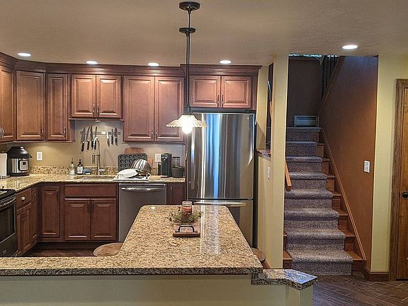 Four season mountain escape! Rare, fully remodeled, open concept 2 bedroom, 1 bath chalet condo in the Swiss Mountain community at Seven Springs Resort. Entertaining is a breeze in the spacious, redesigned kitchen with custom cabinets and granite countertops, stainless appliances(convection oven, built in microwave, dishwasher, beverage refrigerator, and refrigerator). Newly painted throughout with solid wood doors and custom trim work, ceramic plank flooring in the foyer, kitchen, hall and bath, newer carpet in living areas, 2nd bedroom, and steps, new lighting throughout, Pergo in master bedroom. Bathroom has tiled shower with built in granite bench, 2 shower heads, custom built vanity storage area, solid wood vanity with granite top and copper vessel sink. A mountain stone corner fireplace with BuckStove wood burner makes the living room cozy. The condo also has a stackable washer/dryer and lots of storage space. Bedroom #1 has a king size bed with 2 closets, part of the back deck was transformed into bedroom #2, which can be used as a bedroom or a sitting room to enjoy the gorgeous views. This is a ground level condo so you can walk out to the grass, the deck houses a hot tub, pub table and chairs, and grill. Privacy abounds with views of the woods and the front face of the 7Springs ski slopes. The condo is steps from the Resort shuttle bus stop, tennis courts, swimming pool and pavilion. Property is being sold with most of the furniture. This Laurel Highlands retreat is ready to move right in and enjoy!