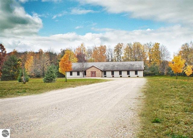 Ready for your own creative floorplan. Pleasant and well maintained nearly 4,000 sq. ft. single story building on 10 acres, located between Traverse City and Kingsley MI. No Steps! This level, one story building is currently being used as a church. This potentially could convert into a very comfortable larger home. There are many uses that are available with a site plan approval by the township zoning administrator. These include: Single Family Dwelling, Two Family Dwelling, State Licensed Residential Facility Other permitted uses when authorized by Special use Permit include: Multiple family dwellings, Bed & Breakfast Establishments, Group Day Care Facilities... Dream Big! Priced to sell. Possible Land Contract terms available. The building floor plan has a large separate meeting area at the south end of the building. The remainder of the floor plan has two centrally located bathrooms, a kitchen in the north end of the building with a large pantry, and a mechanical room with a newer 2 yr. old boiler system for baseboard heat. The remainder of the floor plan is open and ready to suit your needs. Wood trimmed windows and molding and carpeted flooring throughout provide a welcoming and well finished visual. The acreage is a combination of open area and some woods. Plenty of area to build accessory buildings for your horses. Contact listing agent for more information.