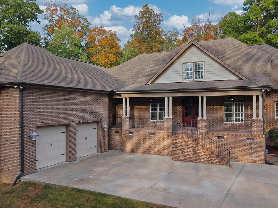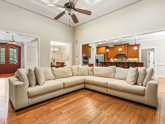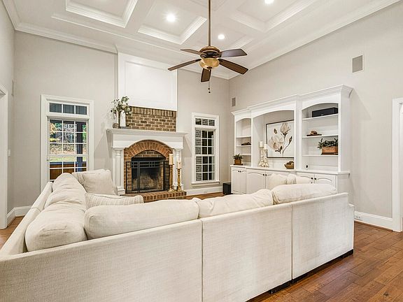 Welcome to this custom crafted, 4 bedroom + flex room, 3.5 bath brick home, tucked away on over 3 secluded, wooded acres. From the moment you step through the grand French door entrance, you're greeted by a spacious foyer that flows effortlessly into a bright open floor plan with extensive millwork and thoughtful upgrades throughout, every detail has been designed for both comfortable living and elegant entertaining. On the first floor, gleaming hardwoods flow through the dining room, family room, and kitchen. The family room impresses with a dramatic 20-foot coffered ceiling, built-in cabinetry, and an integrated surround sound system. The gourmet kitchen is thoughtfully designed with custom cabinetry featuring pull-out shelves and a spice rack, Corian countertops, a large center island, gas cooktop with downdraft exhaust, pot filler, under-cabinet lighting, stainless steel appliances, and dual pantries. The breakfast nook and the primary suite both open to a vaulted screened porch—perfect for relaxing or entertaining while enjoying the peaceful wooded views. The split-bedroom layout includes a spacious owner's suite with a double tray ceiling and a spa-like bath, showcasing dual vanities, a soaking tub, walk-in shower, and an expansive dressing closet. Two additional bedrooms share a Jack-and-Jill bath. A mudroom with built-in, spacious laundry room with sink and a half bath completes the main level. The second floor offers a spacious guest bedroom, a full bath, and a versatile flex room ideal for a media space, hobby area, or home gym. Thoughtfully designed closet space provides ample storage, with all closets crafted with custom wood shelving for a refined, built-in feel. A large walk-in attic adds even more convenient storage options. If that's not enough to capture your attention, step outside the screened porch and patio, and nature awaits. The property features serene wooded areas and a cleared garden space spanning 4,000 square feet, fully enclosed with a 7-foot fence and ready for planting your dream garden or creating your own private outdoor oasis.