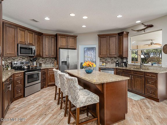 This fully remodeled 2,464 s/f 4-Bedroom, 2 bath home located in the popular Carriage Gate Subdivision in West Melbourne is perfect for a growing family .The main living area and kitchen is spacious with beautiful finishes ,including S/S appliances extra large sink with pot washer , breakfast counter and convenient pass-through to lanai. The breakfast nook and family room both lead to the covered lanai . Enjoy a cozy fireplace in the family room with the touch of a button . The home includes crown molding ,wood-look tile in the main living areas and Anderson Hurricane Rated windows adorned with custom blinds . The master suite is complete with soaking tub, his and hers vanities and glass sliders to the lanai . The outdoor space includes a covered lanai and resort style pool and spa .