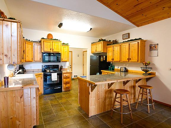 Immaculate and low maintenance single level 3 bedroom 2 bath with a 3 car garage at MeadowCreek Golf Resort. Nicely perched on a level bench one acre site with outstanding separation from neighbors. Flowing open great room plan with wood ceilings and knotty pine doors and accents. Cozy stacked rock propane fireplace. Tiled kitchen countertops with slate flooring in kitchen and dining areas. Exterior is low maintenance lap hard plank siding and composition roof. Two covered paver patios, one front and one rear. Low maintenance yard. Enjoy the amenities of MeadowCreek, golf, pool, tennis, pickle ball, fishing pond, river trail.