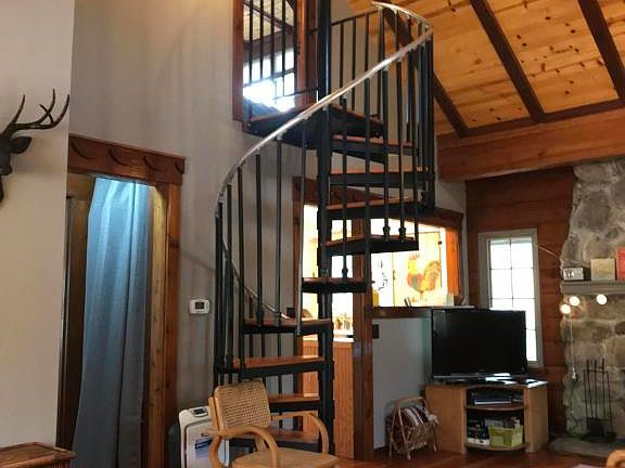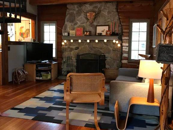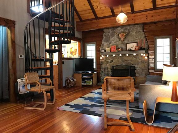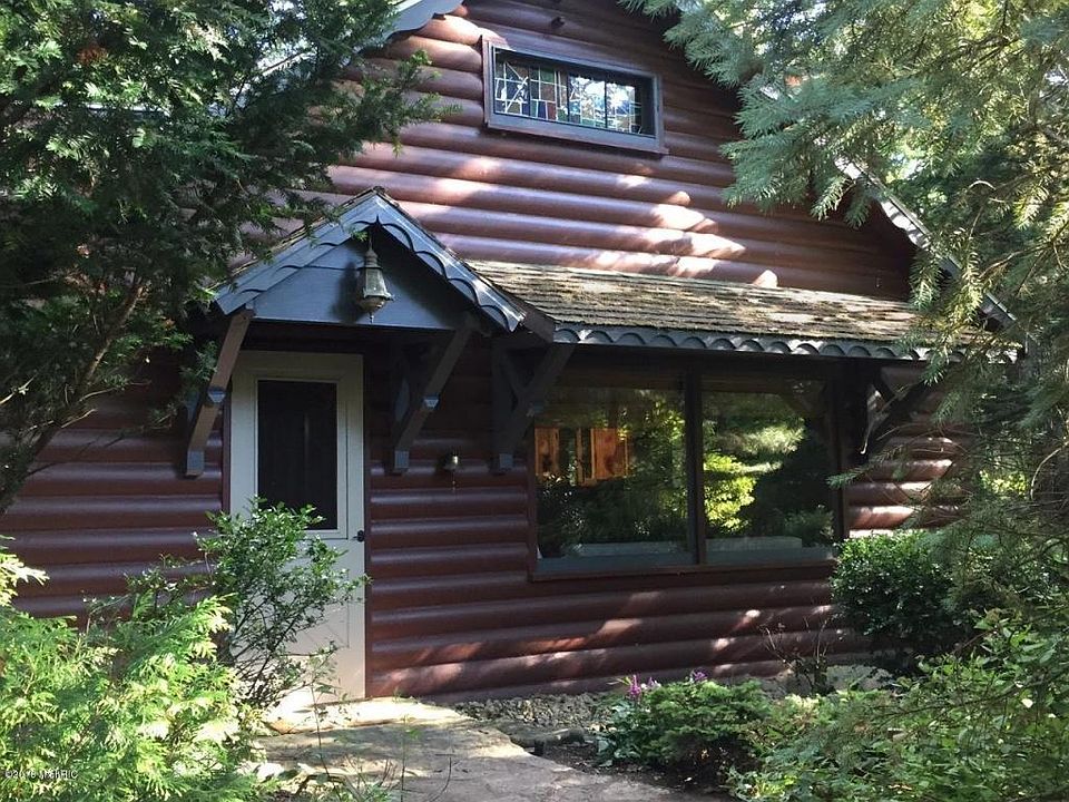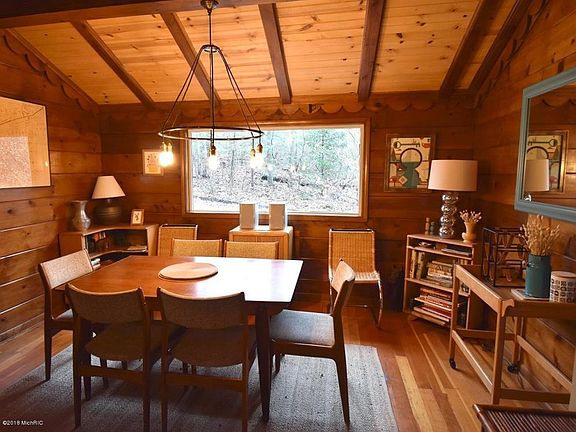 1930's Michiana cabin with lots of vintage charm and many original features, extremely well-cared for, full season home. 8 minute (0.4 mile) walk to deeded beach access in Michiana. Over half an acre private, wooded lot with barn and garden shed, lot backs up to creek. Fenced in back yard, upper and lower patios and back deck for lots of outdoor living. Main level combined living and dining area with vaulted ceilings and fir wood floors. Full bath with original farmhouse sink. Original river rock stone, wood burning fireplace is feature of living room. Large master suite upstairs with exposed beams, wide plank wood floors, renovated bathroom. Original kitchen cabinets, original exterior doors and door handles. Two story barn offers additional 800 sq ft ready for renovation into a bunk room , art studio, wood shop, etc! Most furniture included.